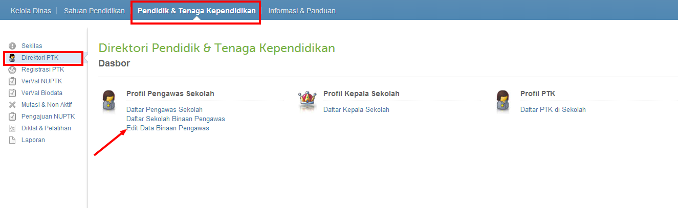 Fitur Edit Binaan tersebut dapat diakses melalui modul PTK > Direktori PTK > Edit Data Binaan Pengawas. Pengawas yang dapat dikelola adalah Pengawas yang telah berbintang Empat.