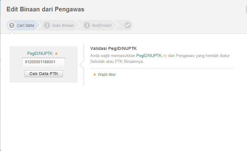 - Langkah pertama, masukkan PegID/NUPTK dari Pengawas yang hendak diatur Sekolah atau PTK Binaannya. Kemudian klik Cek Data PTK.