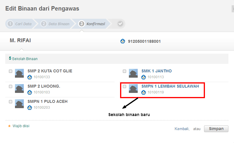 - Konfirmasi daftar sekolah yang baru ditambahkan, jika benar klik tombol Simpan.