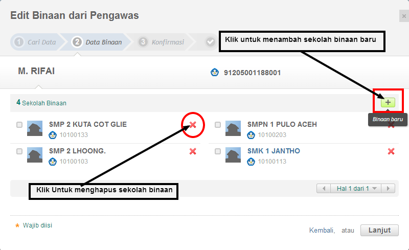 binaan yang telah ada maupun menambah sekolah binaan baru. Untuk Menghapus sekolah binaan, klik tombol silang merah pada daftar sekolah yang akan di hapus, untuk menambah sekolah binaan baru klik tombol Tambah, kemudian pilih sekolah yang akan ditambahkan pada halaman pop-up yang muncul. Klik Lanjut jika sudah.